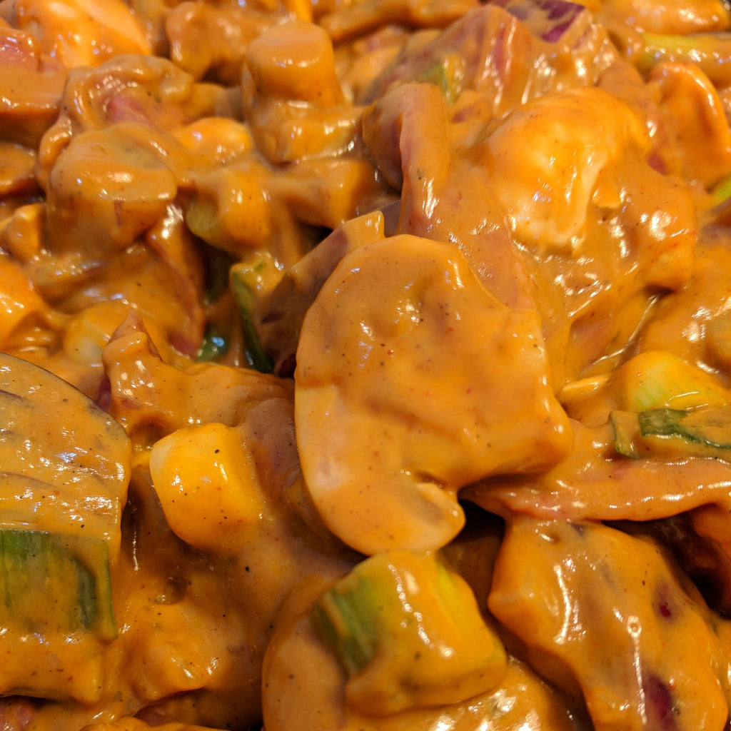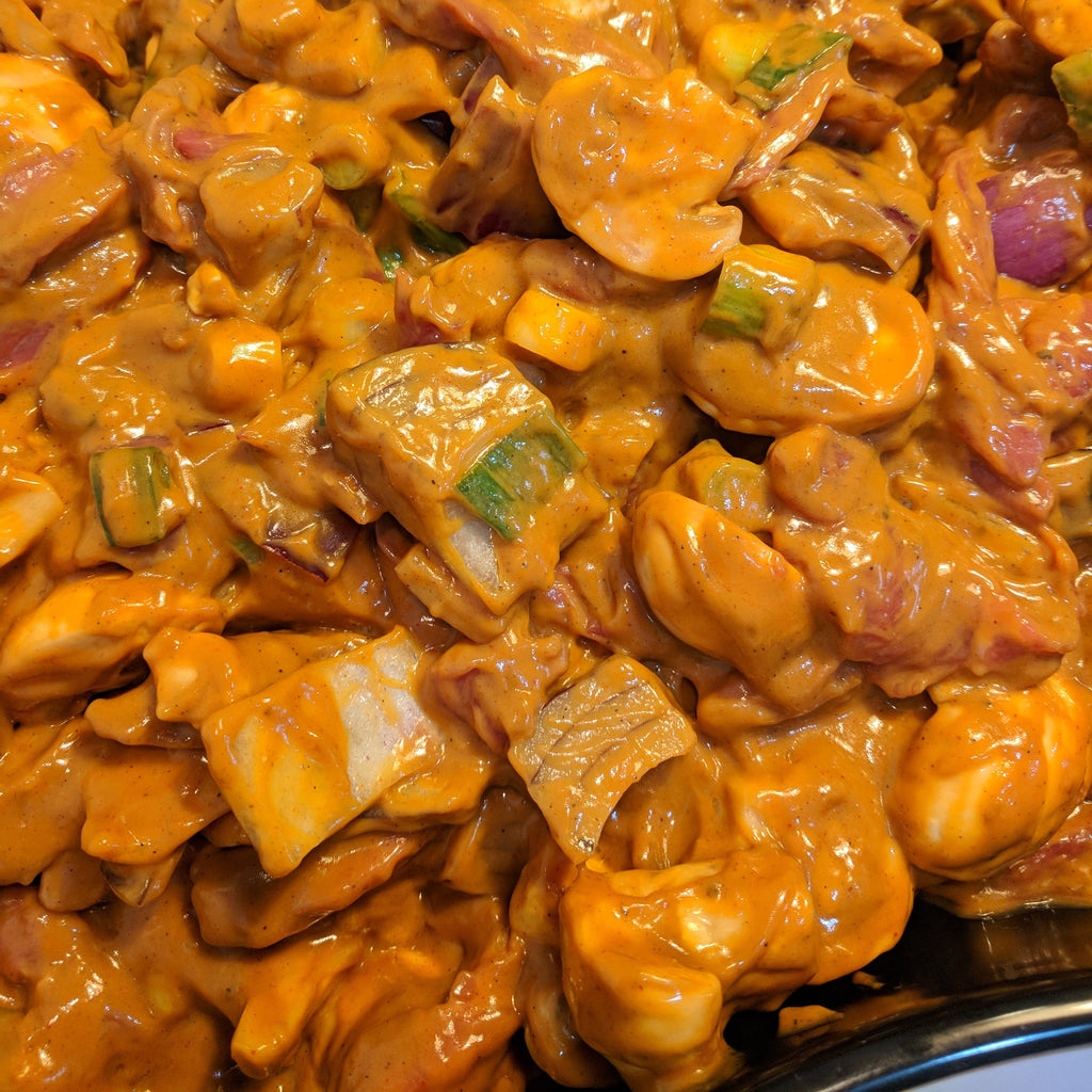 Prime cuts of beef steak marinated in red wine with smoked bacon, onion and mushroom in a rich creamy burgundy sauce. Served in an oven ready tray, great with rice or potatoes.